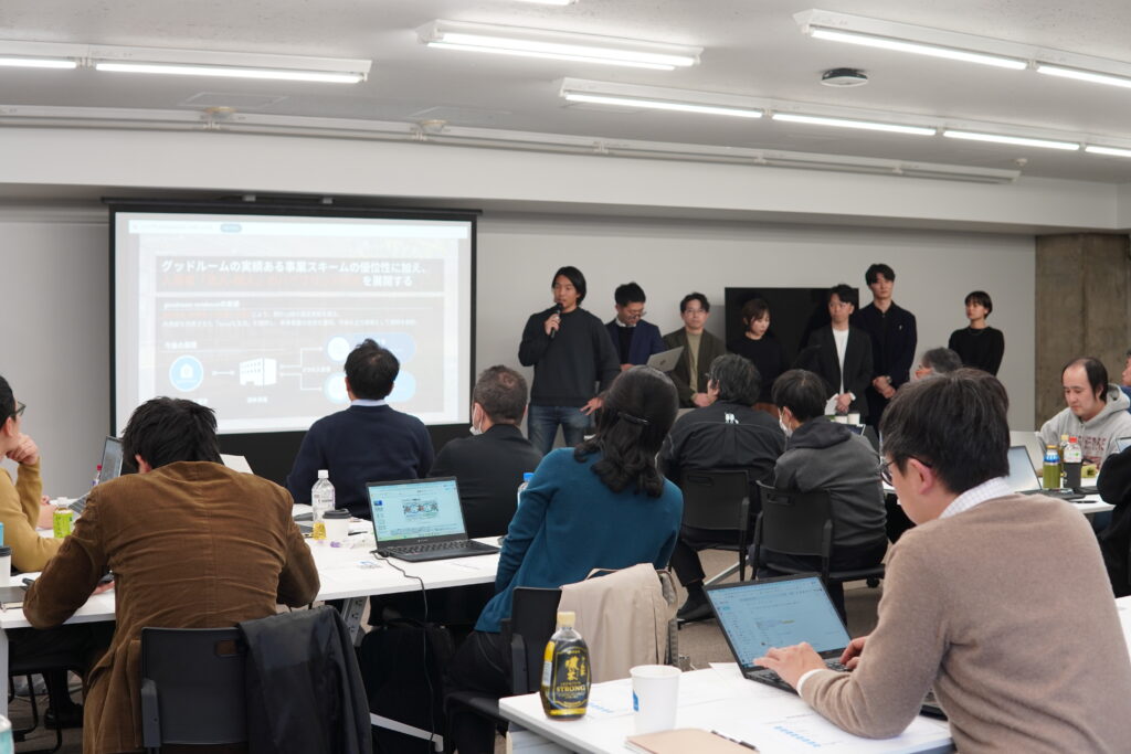 いよいよ始まったピッチでは、計6チームが登壇。 各チームが掲げるテーマは、既存の不動産・テクノロジー事業の枠組みを大胆に超えるものから、現代社会の課題を独自の視点で解決しようとする事業案まで、非常に多彩なものでした。