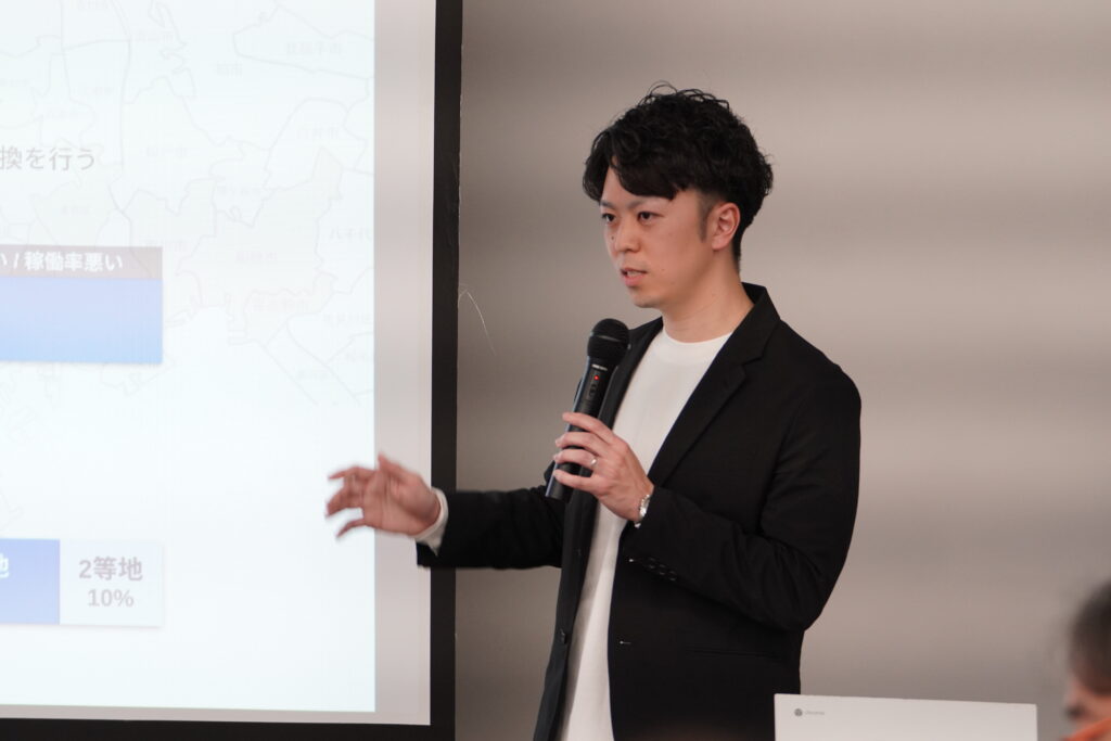 いよいよ始まったピッチでは、計6チームが登壇。 各チームが掲げるテーマは、既存の不動産・テクノロジー事業の枠組みを大胆に超えるものから、現代社会の課題を独自の視点で解決しようとする事業案まで、非常に多彩なものでした。